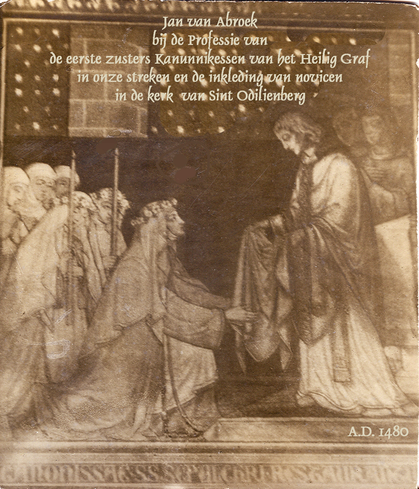 Het ligt voor de hand dat Meynt van Abroek samen met twee andere zusters van het Roermondse klooster van de Faliezusters namelijk Zuster Catharina van Wert en Zuster Catharina van Brüggen het noviciaat in het gastenhuis voor vrouwen te Sint Odiliënberg deden. Op 8 oktober 1480 legden zij daar hun professie af5 om de volgende dag per huifkar al naar het nieuwe klooster in Kinrooi (dat de kanunniken reeds in 1478 verlaten hadden) te reizen. Diezelfde dag werden nog drie andere sepulcrinessen ingekleed. Zo is Sint-Odiliënberg letterlijk de bakermat van het klooster te Kinrooi en daarmede ook van alle nog bestaande Heilig Grafpriorijen, met uitzondering van de priorij in Zaragossa. Op 9 oktober 1480 betrokken de zusters dus het Kinrooise klooster O.L. Vrouw van Jeruzalem, ook genaamd Godtshuys onsser Liever-Vrouwen-Wil-en-Eer. Was het Jan van Abroek die deze laatste naam aan het klooster gaf? Was Wil-en-Eer de leuze van Jan van Abroek?